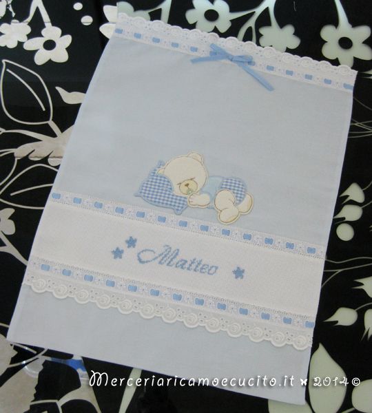 Sacchetto-nascita-elegante-e-bavette-per-Matteo-6 17 marzo 20144 commenti su Sacchetto-nascita-elegante-e-bavette-per-Matteo-6 Sacchetto nascita elegante celeste con orsetto nanna e bavette personalizzate per Matteo
