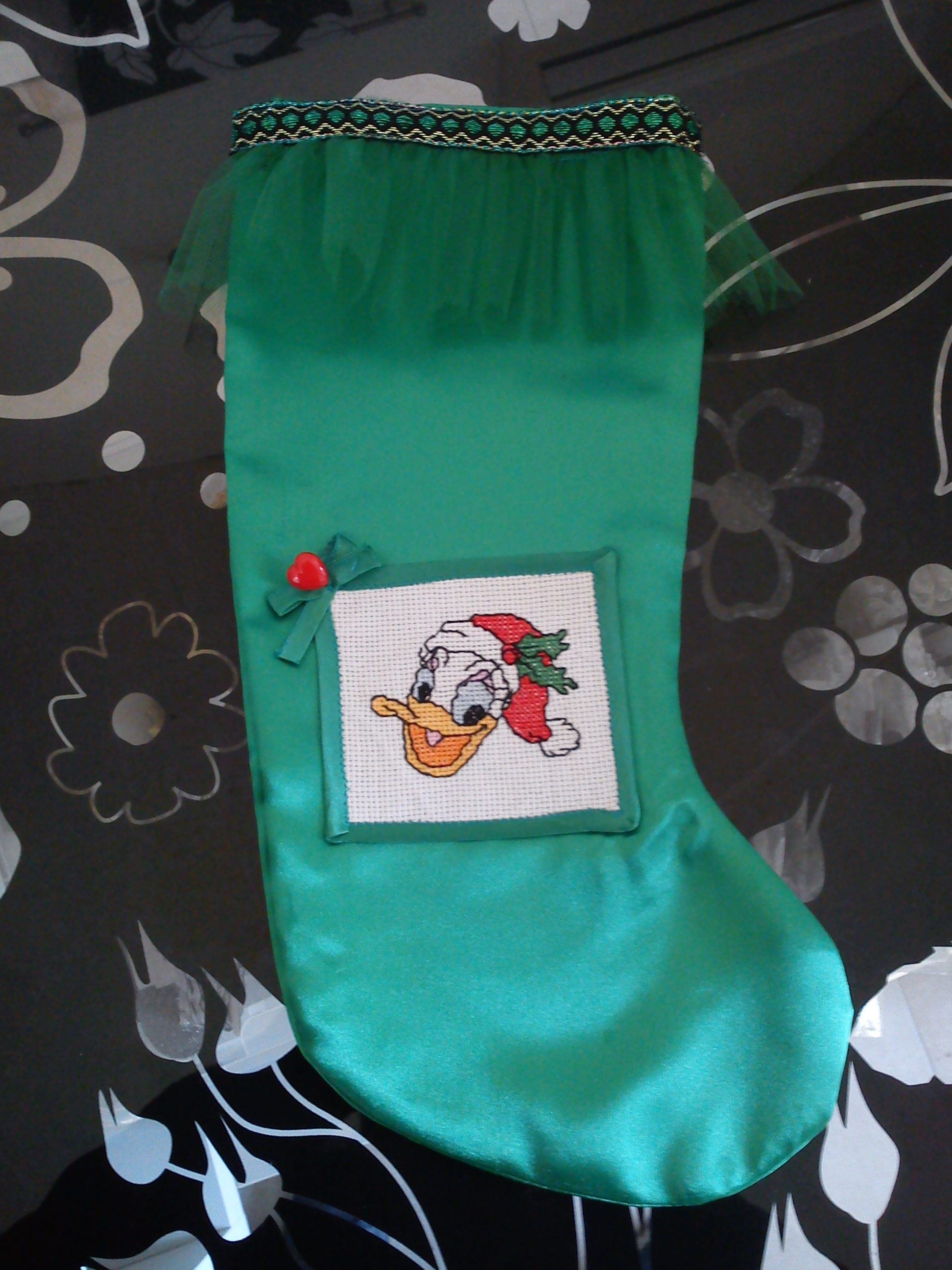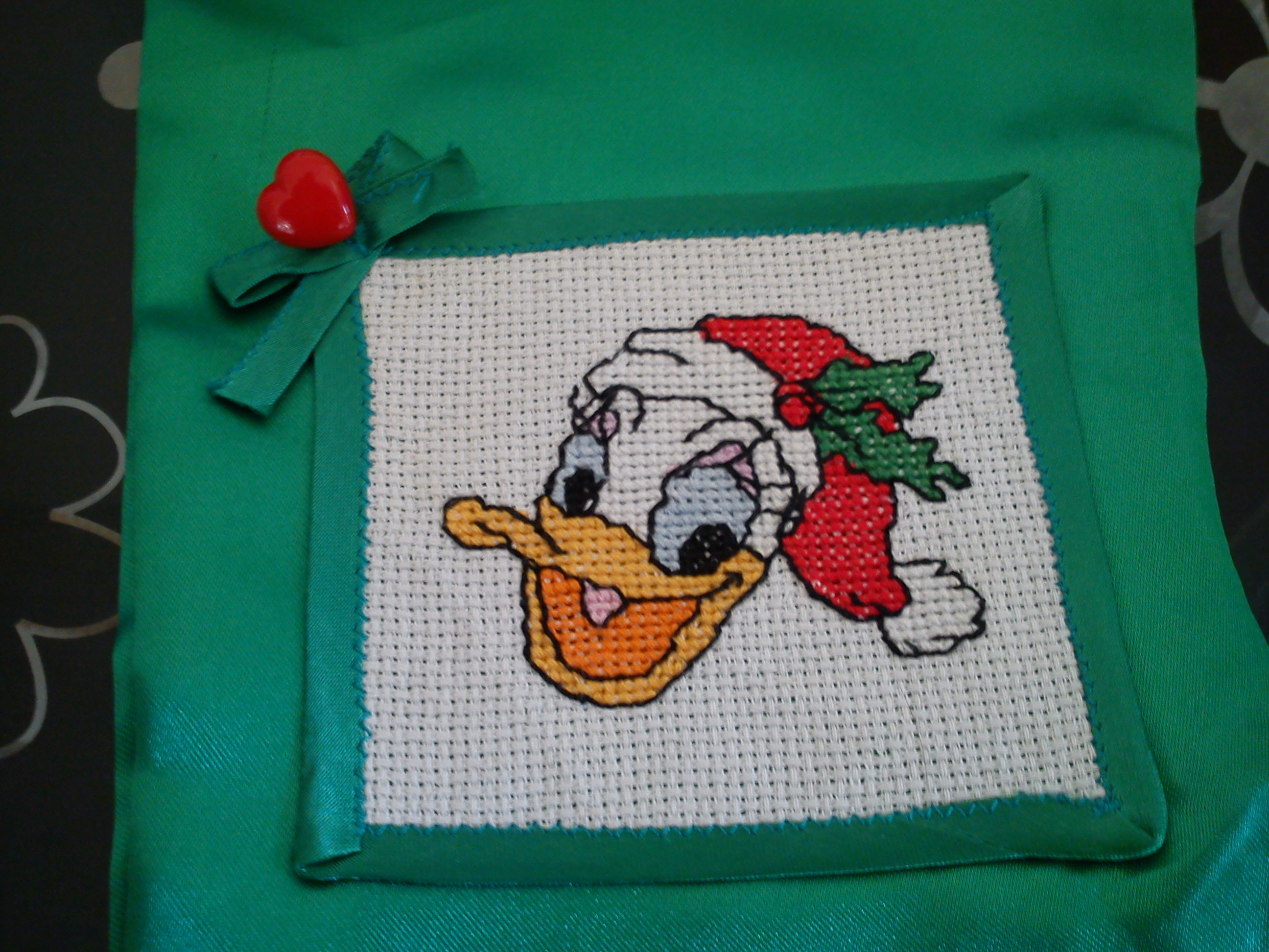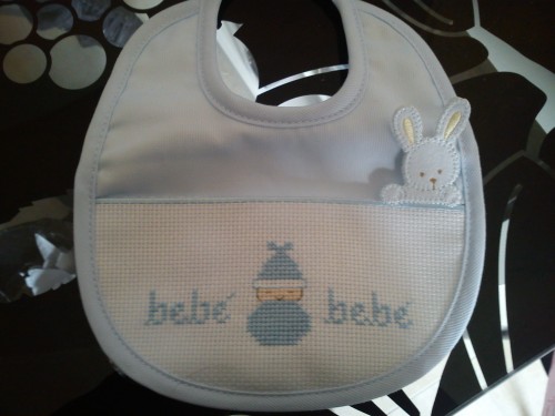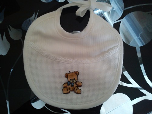 Bavetta in piquet, con inserto in tela Aida. Ricamato a mano con cotone DMC.