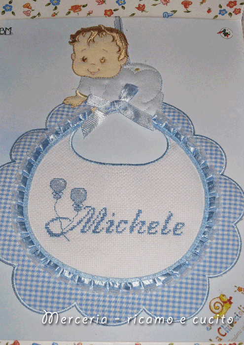 Sui sacchettini sono stati ricamati a punto croce il nome Domenico per il maschietto e Francesca Miriana per la femminuccia.